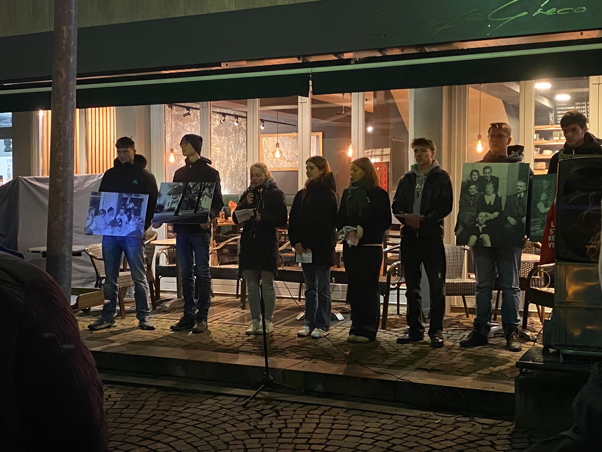 Einige Schüler und Schülerinnen des Q1 Geschichtsprofils lasen dort einen fiktiven Dialog zwischen Harry Lehmann und Gertrud Eickhorst über ihre Erlebnisse und Erfahrungen in Ahrensburg zwischen 1933 und der Nachkriegszeit vor. Harry Lehmann ist einer der beiden Brüder von Magnus Lehmann, die überlebt haben.Das Ehepaar Gertrud und Friedrich Eickhorst führten die hoch angesehene Adler Apotheke und haben den Holocaust überlebt. Gertrud Eickhorst wurde als Jüdin wegen auffälligen Verhaltens in ein Frauenzuchthaus in Lübeck gesperrt. Sie kam nach 3 Wochen wieder frei und musste mit ihrem Mann bis Kriegsende im Untergrund Hamburgs und in der Umgebung Ahrensburgs leben. Sie haben sehr für ihre Apotheke gekämpft und konnten sie letztendlich im August 1950 zurückerhalten.