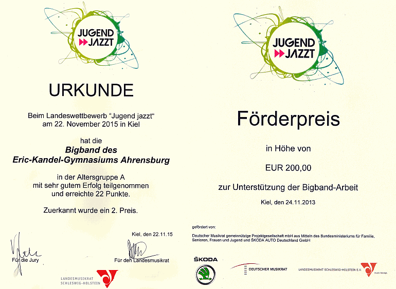 Die Big Band des Eric-Kandel-Gymnasiums hat in diesem Jahr beim Landeswettbewerb Jugend jazzt, durchgeführt vom Landesmusikrat Schleswig Holstein, den 2. Platz belegt.