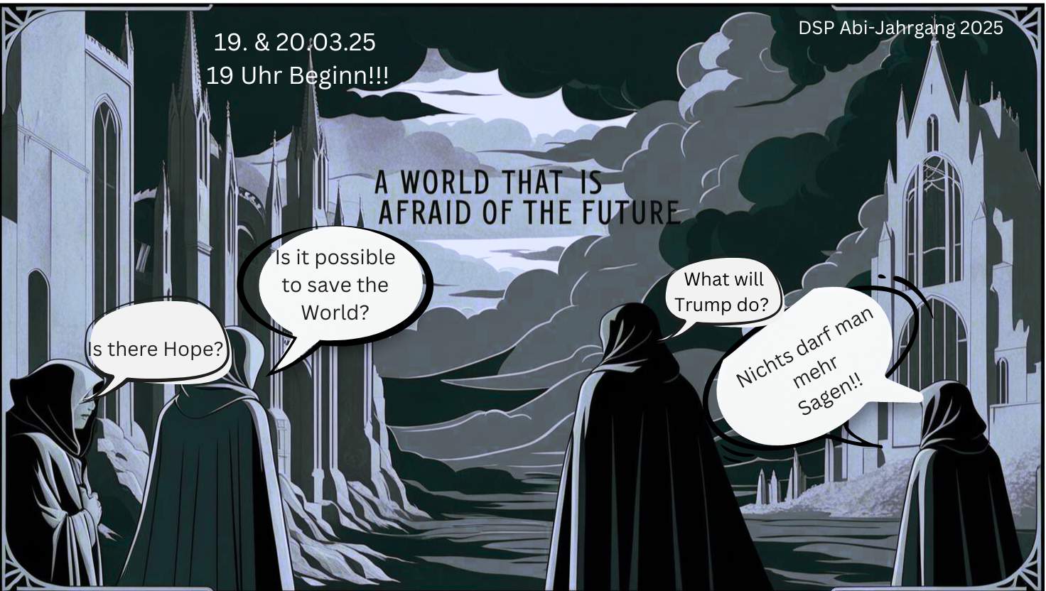 Die DSP-Kurse des Abiturjahrgangs präsentieren in einer collagenhaften Funktionsuntersuchung ihre bisherige Laufbahn: die Suche nach Extremstellen im eigenen Leben findet in einer Gegenwartsbetrachtung ihren Platz.