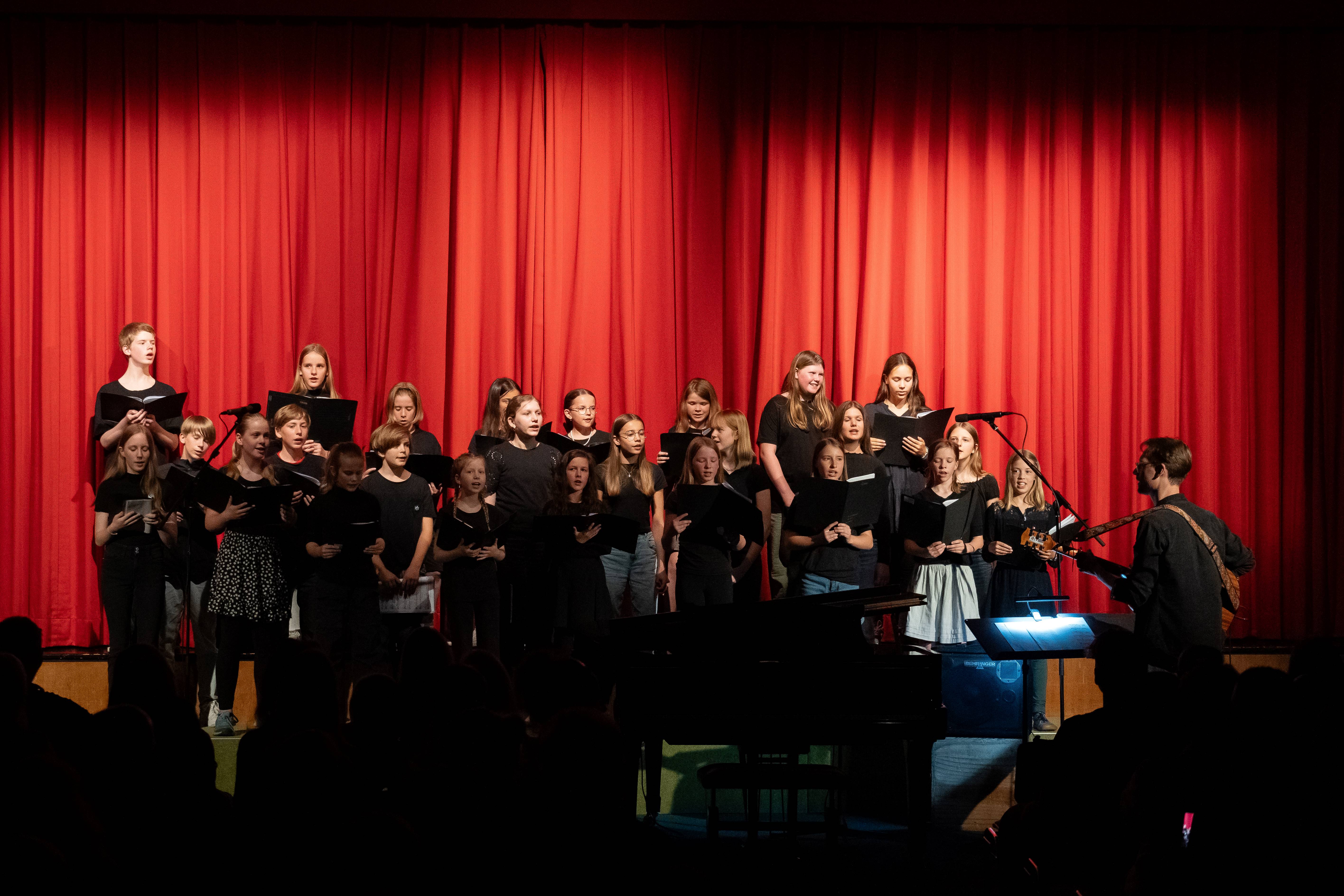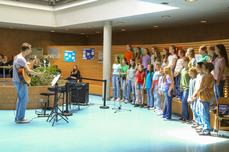 Es folgt der Chor der 5./6. Klassen des Eric-Kandel-Gymnasiums unter der Leitung von Herrn Hebrock mit „Go Solo“ von Tom Rosenthal und „ How Do I Say Goodbye“ – ein bewegendes Abschiedslied des australischen Sänger und Songwriters Dean Lewis. Beides begleitet Herr Hebrock auf der Gitarre. Danach präsentiert der Chor aus 25 Jungen und Mädchen den Klassiker „Over the Rainbow“ aus dem Musical „Der Zauberer von Oz“ mit Herrn Hebrock am Flügel und zuletzt „Pompeii“ von Bastille. Großartig!