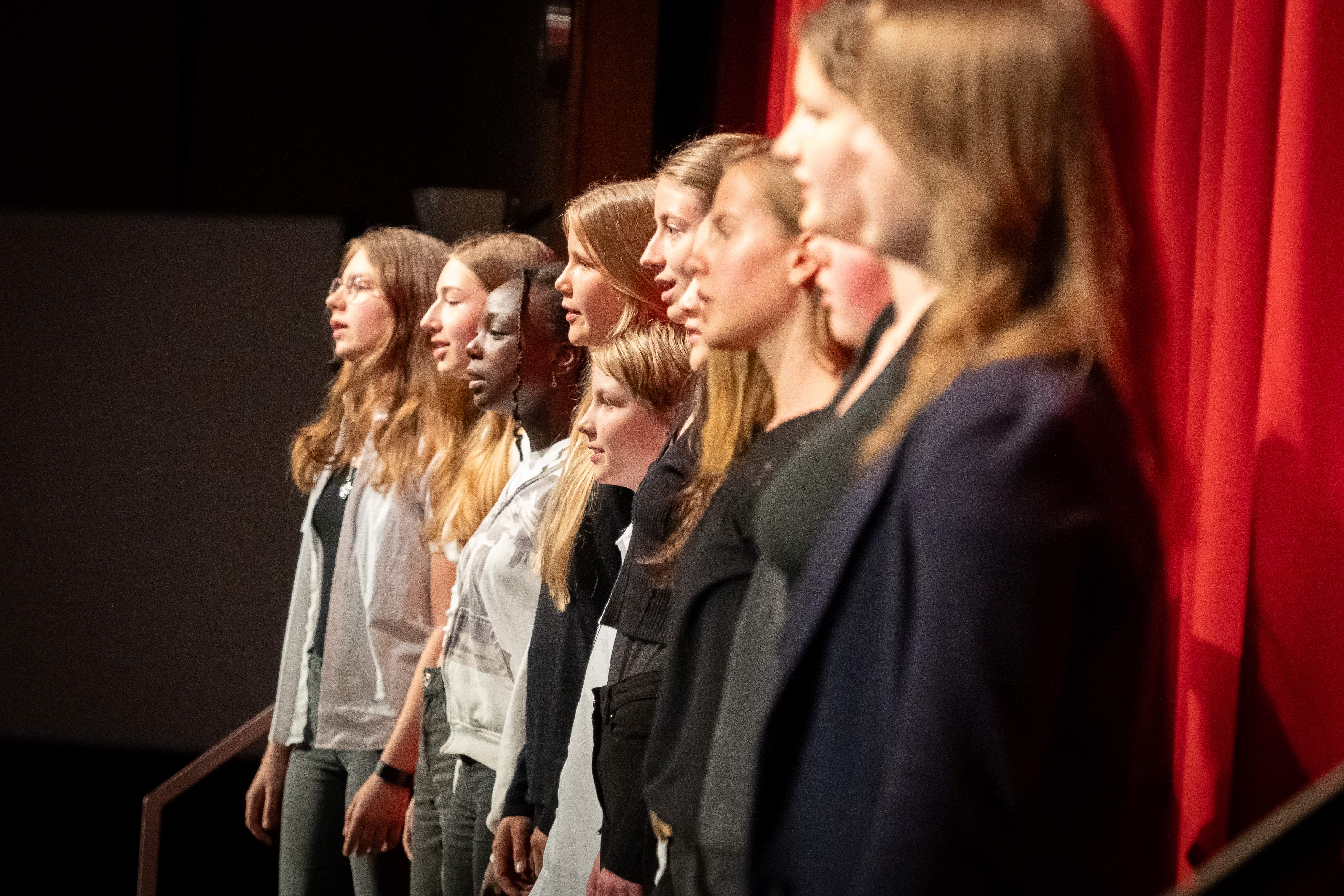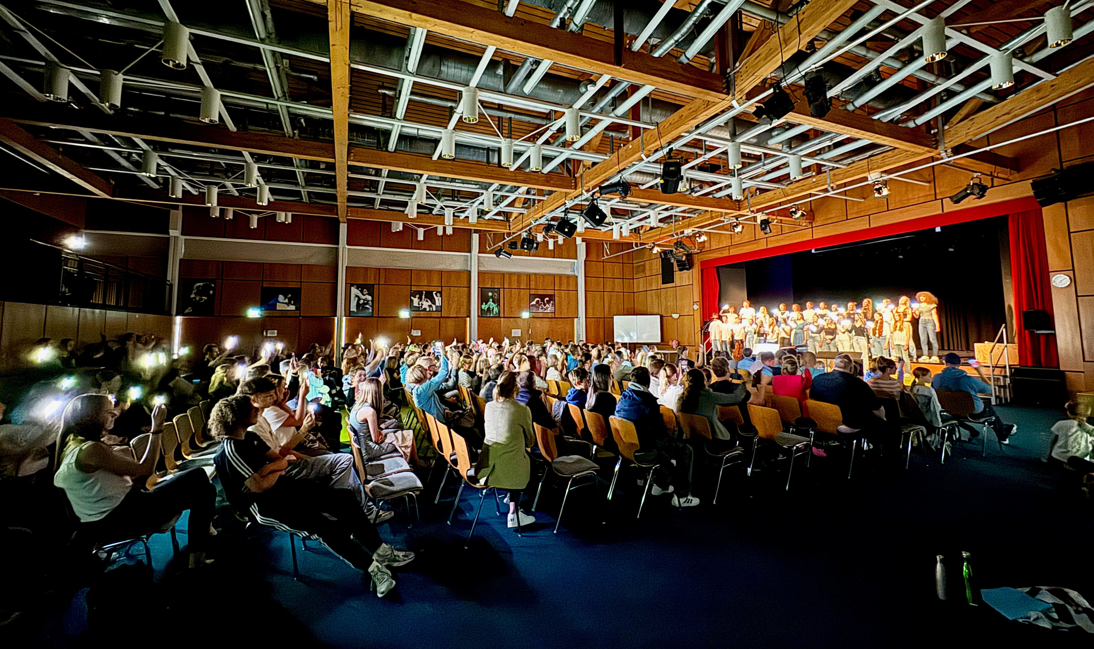 Zum Schluss tritt der Chor der Klassen 7+ unter der Leitung von Frau Koch auf und präsentiert „Stitches“ von Shawn Mendes, „Man in the Mirror“ von Michael Jackson und inspiriert von einer früheren Aufführung des EKG-7+ Chors das Lied „Hold Back the River“ von James Bay – alle Stücke mehrstimmig und begleitet von Frau Koch am Flügel. Der Chor beendet den musikalischen Abend mit dem Song „You are the reason“ von Calum Scott – dazu schwenken die Sängerinnen und Sänger ihre Smartphones mit eingeschalteter Taschenlampe und tauchen das Forum in eine stimmungsvolle Beleuchtung.