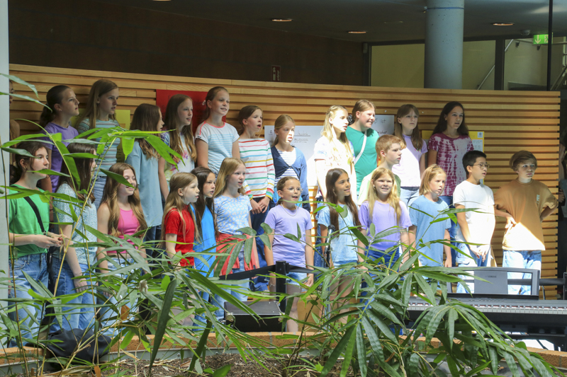 Der Abend beginnt mit dem Unterstufenchor unter der Leitung von Frau Kröger des Emil-von-Behring-Gymnasiums, der in Kurzfassung Szenen aus dem Musical „Der kleine Tag“ – als Vorgeschmack auf das bald folgende Musical präsentiert. Zwei kleine Tage – zwei kleine lebendige Lichtwesen, die nur ein einziges Mal zur Erde reisen dürfen, erleben hier bei uns auf der Erde zauberhafte Alltagsmomente vertont durch Frau Kröger am Flügel und dem Chor, aber durch wunderbare Solostimmen. Es lässt die Vorfreude auf die Musicalaufführungen steigen: am 17./ und 19. Juni wird „Der Kleine Tag“ hier an Ort und Stelle und in voller Länge aufgeführt.